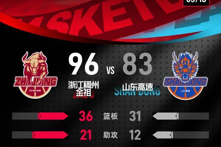 【搜狐体育战报】北京时间3月16日CBA常规赛第26轮,客场作战的浙江稠州金租以96-83击败山东高速。达米安·琼斯22分10篮板2助攻,基昂泰·约翰逊18分2篮板2助攻。全场比赛山东男篮外线命中率极差,三分球命中率仅为18.8%,高诗岩出场26分46秒运动战6投0中,依靠罚球拿到6分。