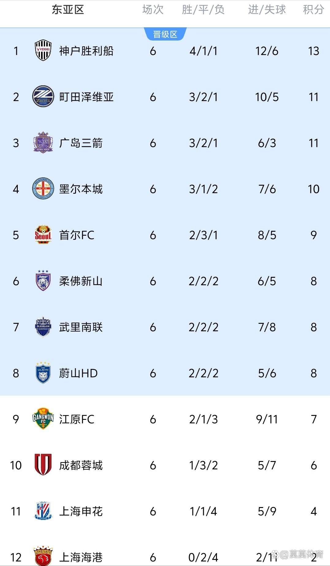 6轮比赛全部结束后,东亚区积分榜彻底清晰了:神户胜利船13分排在第一,再拿1分就能锁定晋级名额;町田泽维亚和广岛三箭紧跟在后面,只要再赢一场就能稳稳进入前八。再看中超三队,处境特别差——上海海港只剩下理论上的出线可能,上海申花和成都蓉城则被逼到了绝境,接下来的两轮比赛必须全部赢下来,才有一点点晋级希望。